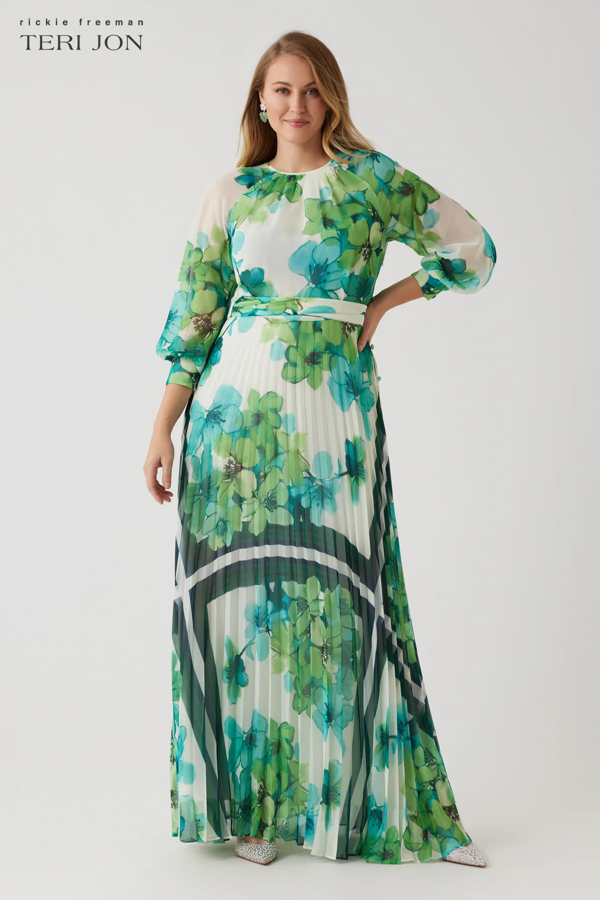 This chiffon pleated multi-print gown combines a flowing silhouette with a vibrant floral pattern. Offering a blend of elegance and contemporary style, the jewel neckline, long sleeves, and removable sash offer just the right amount of coverage. The addition of the pleated skirt adds graceful movement to every step, while the breathable material makes this dress ideal for any time of year. Pair with gold accessories for a finished look.