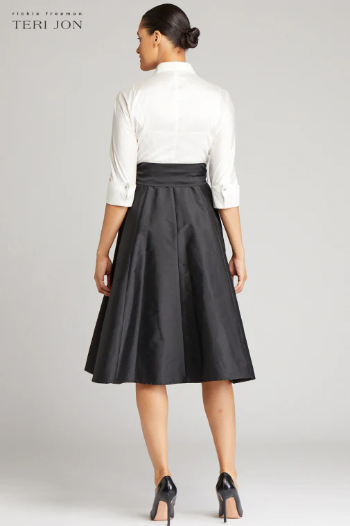 The essential closet staple shirtdress is back! Made in our classic taffeta this Black and White color blocked dress features a 3/4 sleeve collar and a tie at the waist.Ā