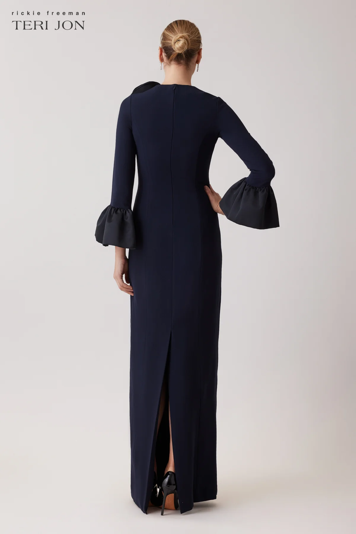 Radiate sophistication in this navy column gown, defined by its sleek, floor length silhouette and impeccable tailoring. Long sleeves end in dramatic taffeta cuffs for a touch of volume, while a sculptural flower at the shoulder adds refined artistry. Understated yet striking, this gown is a timeless choice for black tie weddings, elegant galas, and formal evening celebrations.