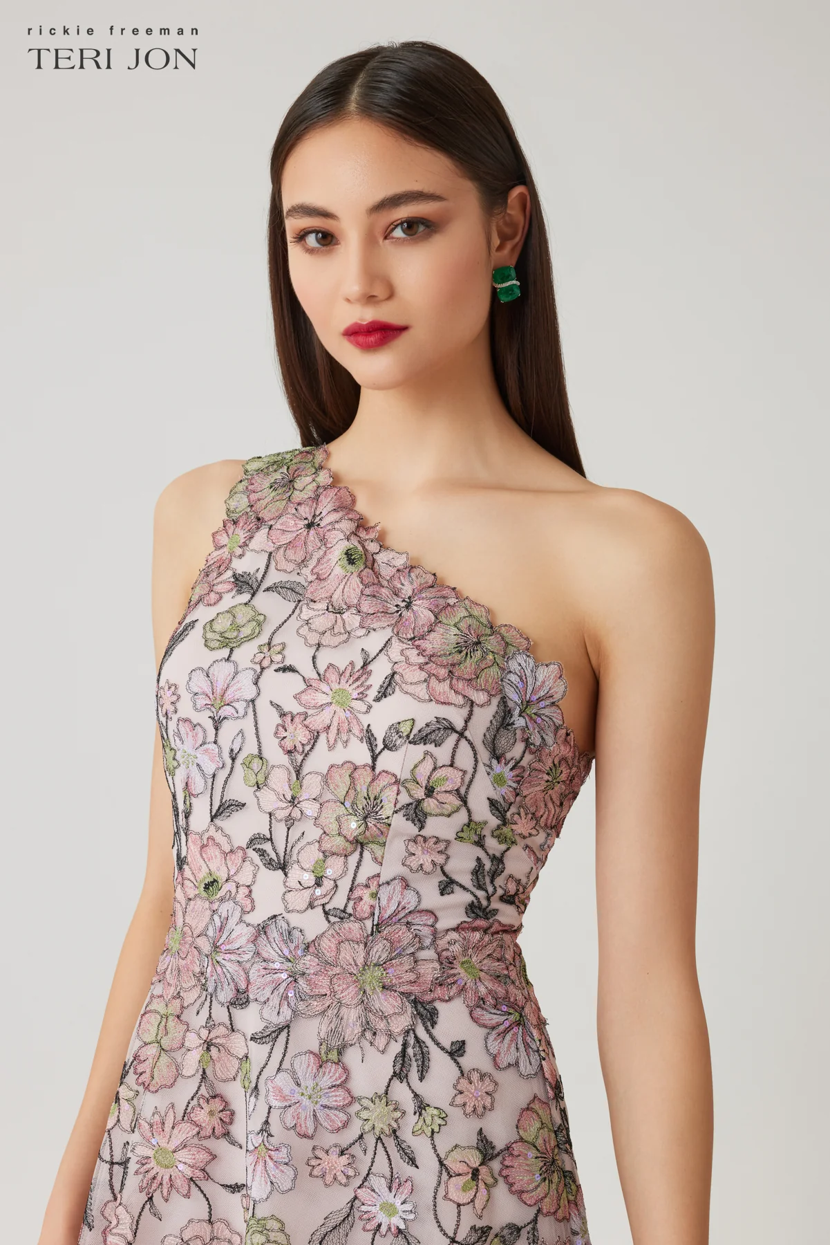 Floral Embroidered Tulle One Shoulder Gown