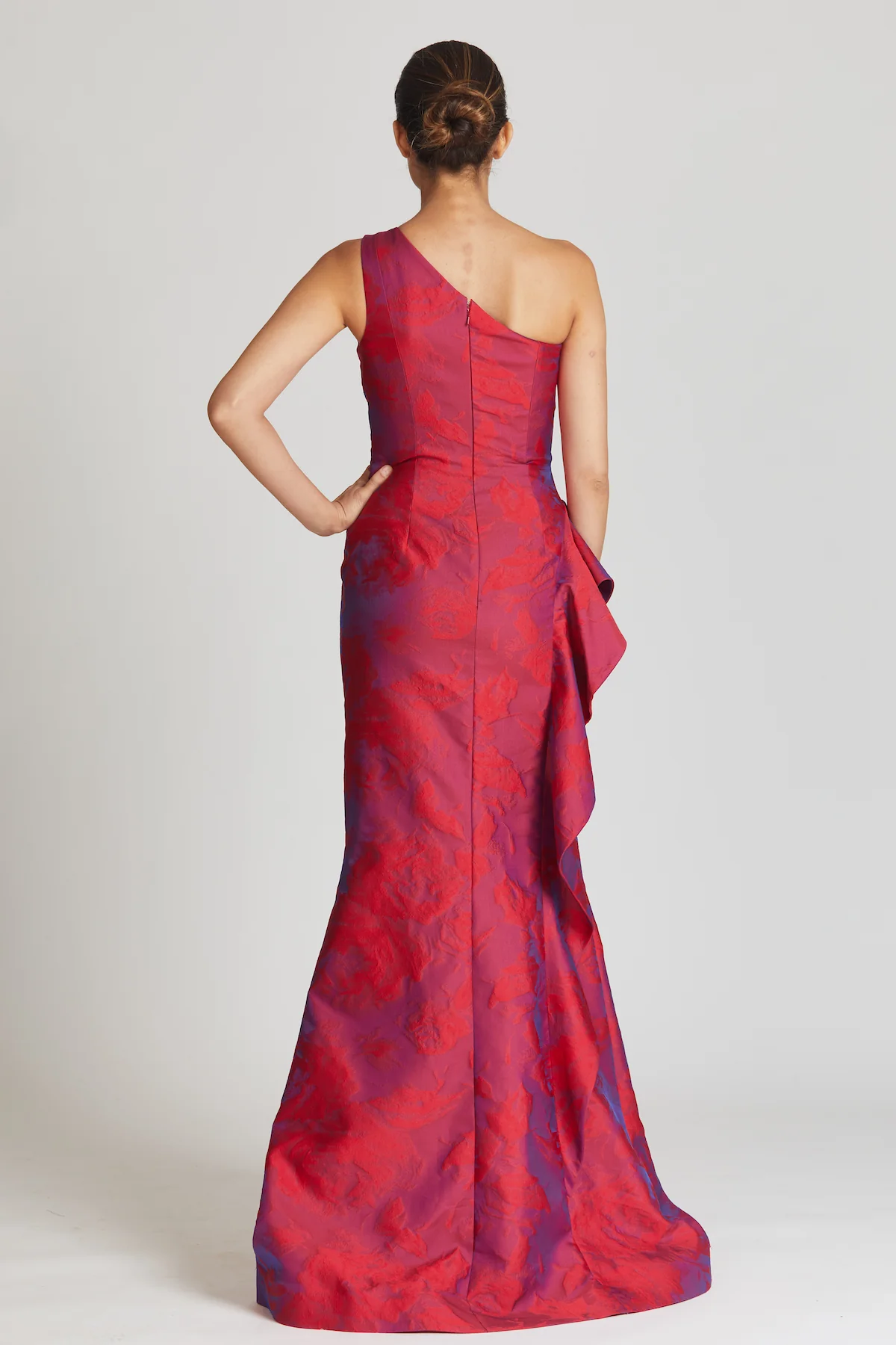 This gorgeous one shoulder evening dress will be the center of attention of every room! This dress features a statement side ruffle and ruching along the bodice that hugs the figure in all the right ways. The Fuchsia jacquard fabric with red detail elevates the already flattering silhouette of the gown.