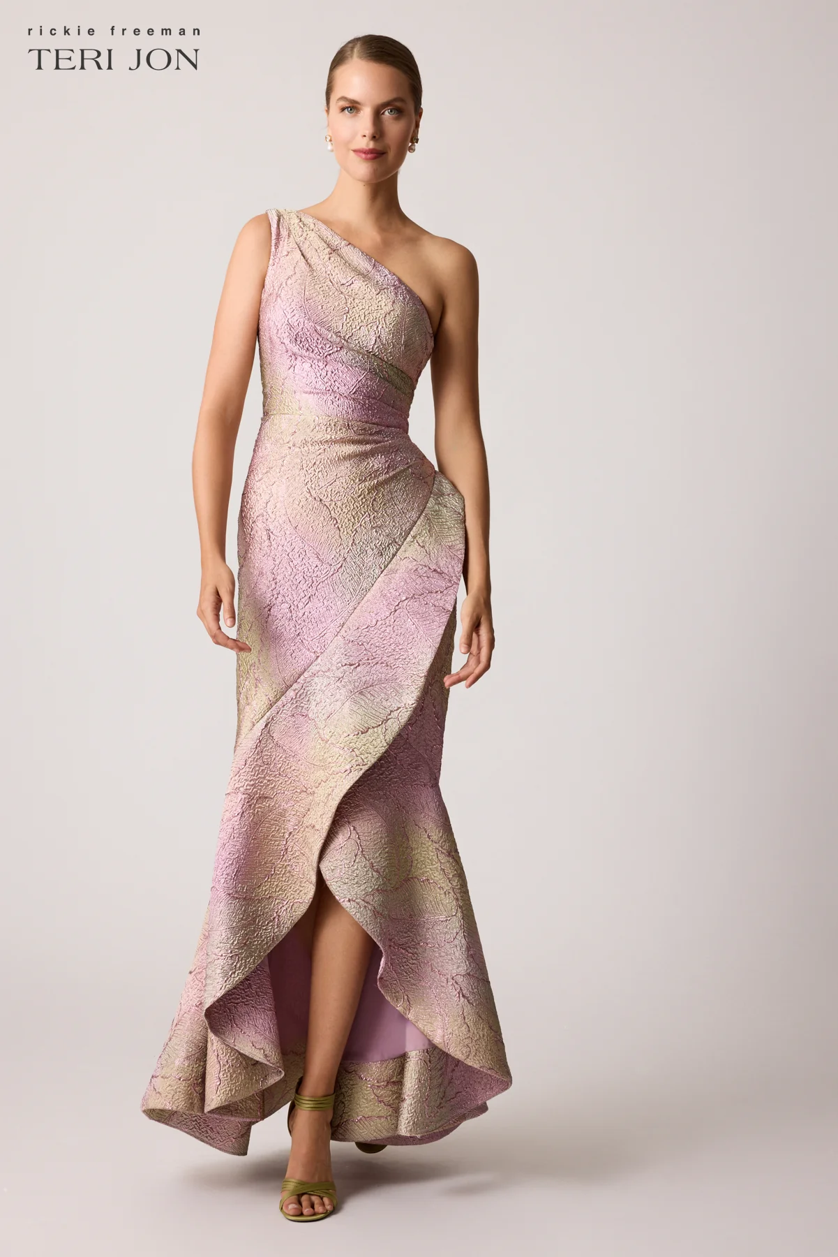 Anything but ordinary, this leaf pattern dress is both form-fitting and sleek. Fashioned from metallic jacquard fabric, this dress shines beautifully against the light and has a flattering silhouette that will hug your curves in all the right places. The one shoulder neckline emphasizes uniqueness and style in a way that is effortless. The ruffle drapes alongside the dress, and the addition of the front slit stuns. This gown is a wonderful choice for weddings and formal parties. Pair with gold heels to compliment this dressās pink hue.