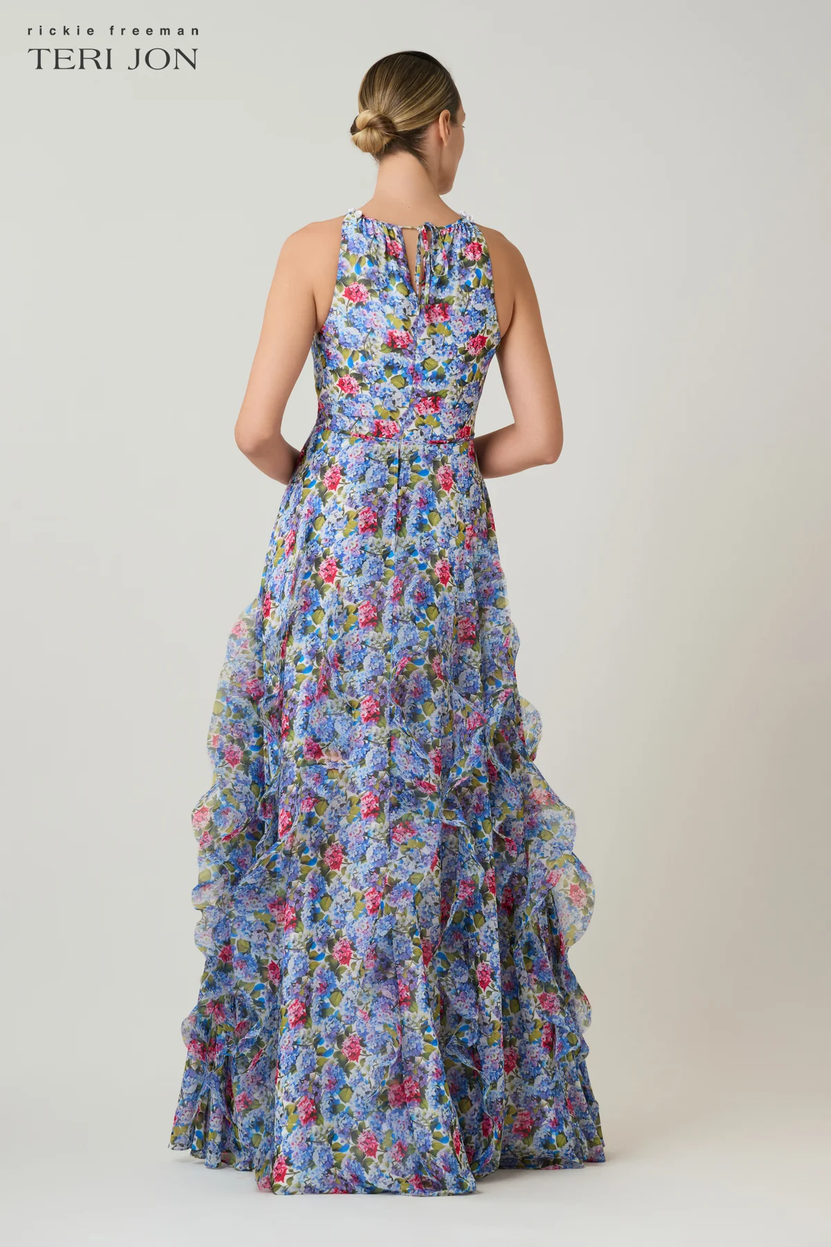 Make a romantic statement in this flowing printed chiffon gown, designed with a vibrant floral print that brings soft color and movement to the silhouette. The halter neckline is accented with delicate beaded trim, adding a refined touch of sparkle at the collar. Crafted with a fitted bodice and a floor length skirt, the design features vertical organza ruffle detailing that enhances dimension and graceful flow. Perfect for garden weddings, destination celebrations, and formal outdoor events where effortless elegance is key.