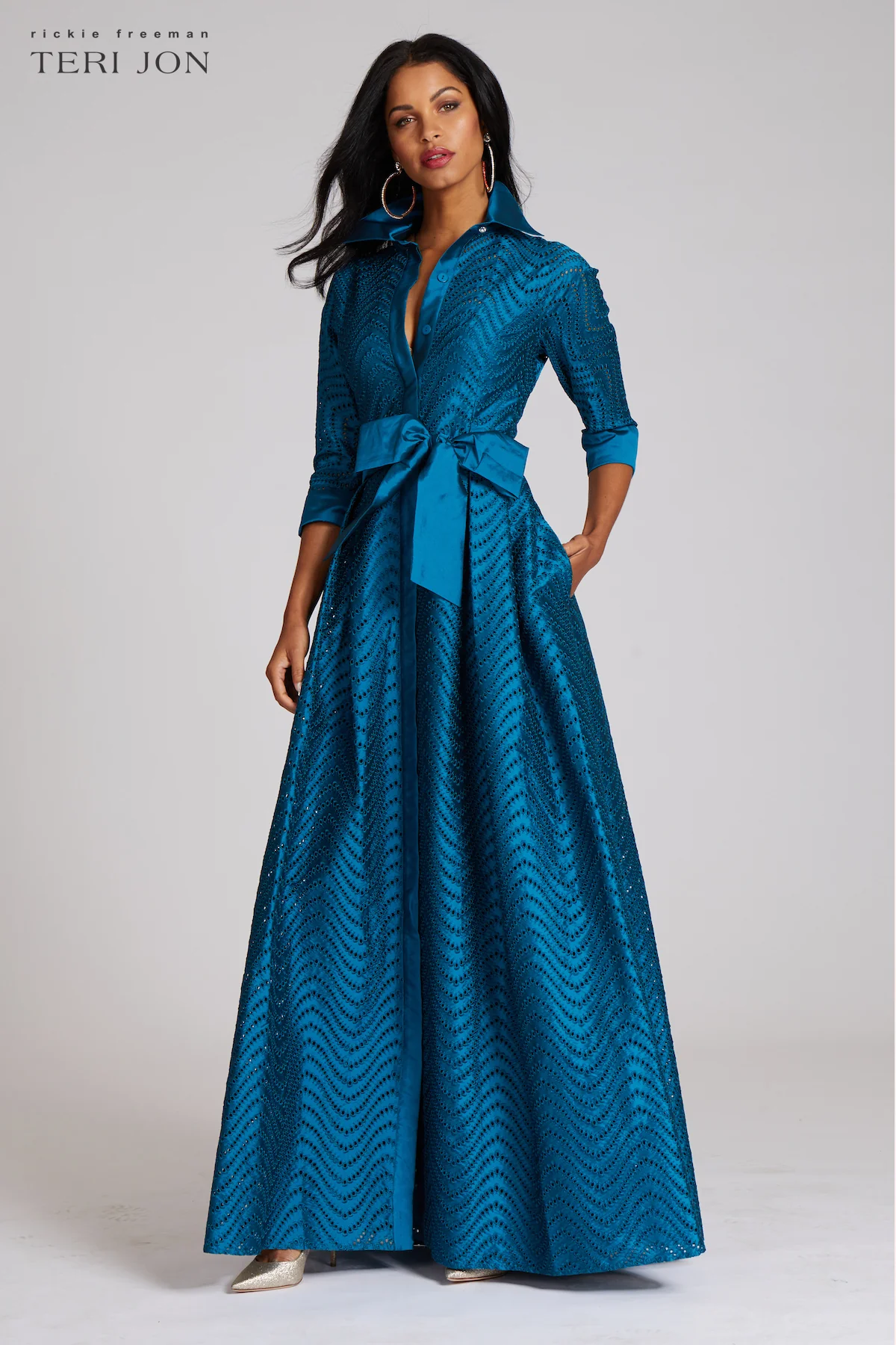 Timeless and formal this 3/4 sleeve eyelet gown is the epitome of classy. With concealed hidden front closure buttons a removable sash belt and cuffed sleeves it is a modest yet flattering dress. The taffeta chevron pattern is unique and pairs extraordinarily with its navy and teal color. Perfect for the mother of the bride/groom black tie event or a charity event.